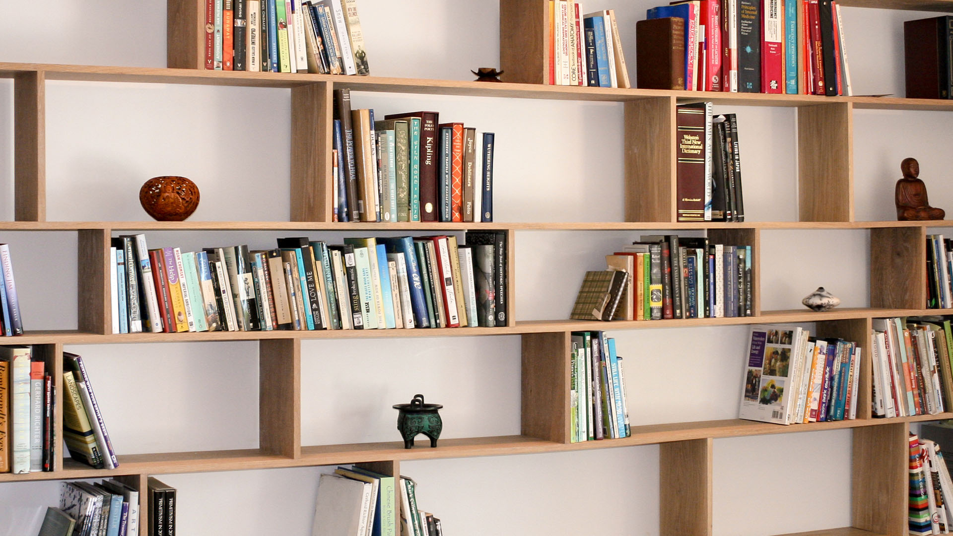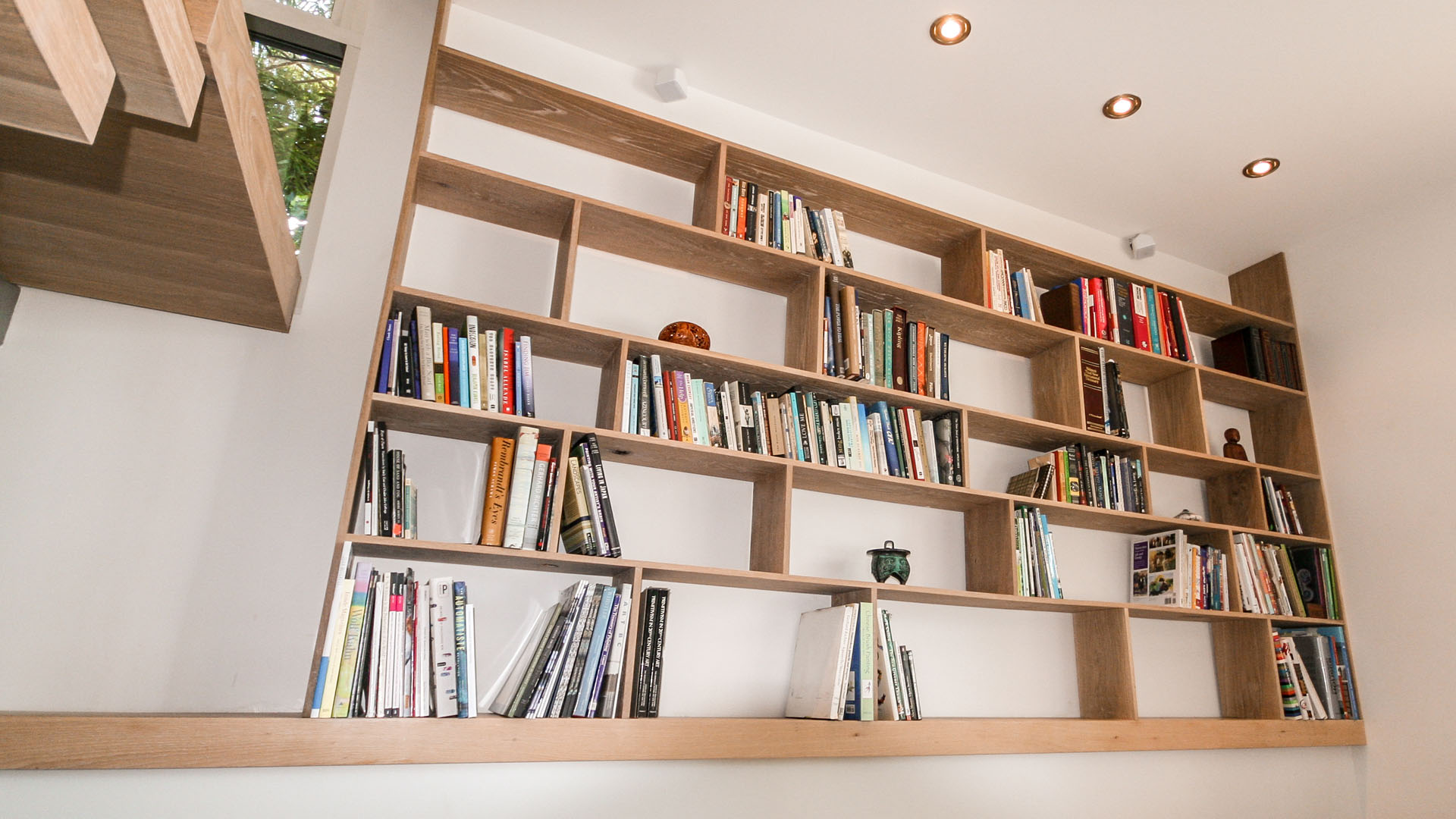Bespoke built-in shelving from solid white oak with a clear finish.